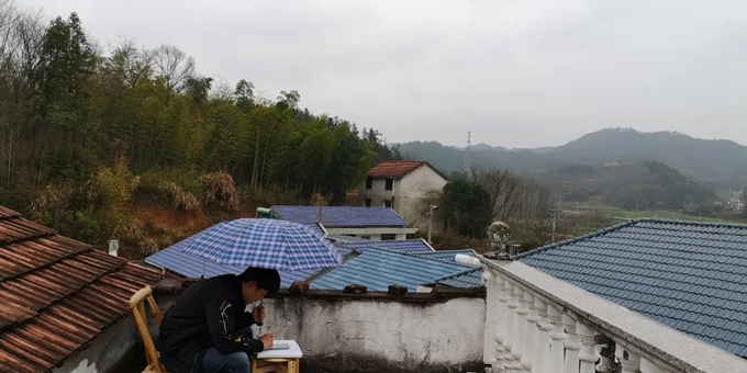 就这样,整整一个多月,袁老师几乎没有停歇。白天,无论天气多么恶劣,他准时出现在别人家的楼顶墙角,上课、备课、找资料,见缝插针和学生讨论创意。下雨了,他打起伞继续上课。晚上,他几乎没早睡过,也很难睡一个好觉。他跟随学生的作息时间随时答疑,晚上零点后在线上指导学生成为常态……尽管累、尽管苦,任凭大山中风吹雨打,他岿然不动。袁老师希望能尽自己的一份努力,教有所成,让学生学有所获,彼此不辜负这段特殊的人生经历。