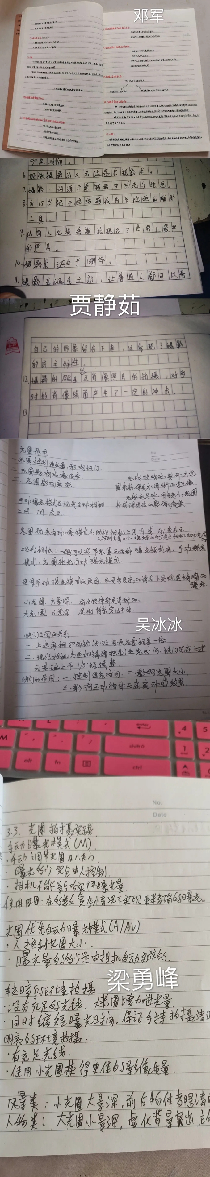 2月17日学校网课开始,袁老师便开始了超负荷工作。说是超负荷,因为一是确实网课任务重,周一到周五每天上午4节课。《商业摄影》《数码摄影基础》这类课程实践性强,即使减掉了一些完全不能进行的实操环节,还是必须配合使用大量的素材。三个年级课头多,课量大,要求特殊,除了每天8点半爬楼顶上课,他必须用大量的心思和时间来备课。不过看到学生们发过来给他检查的上课笔记,大多数都书写的认真工整,袁老师内心还是觉得挺欣慰的。
