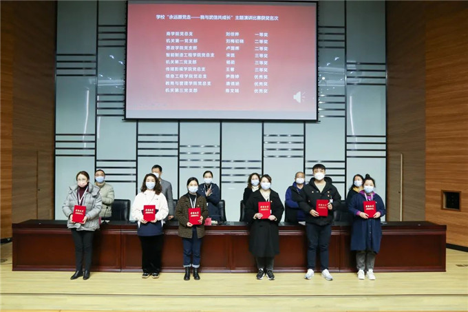 在学校党委举办的“永远跟党走——我与武信共成长”演讲比赛中,我校参赛选手讴歌党的丰功伟绩,深情讲述和武信一起成长的奋斗故事,刘佳晔等9位老师获奖。