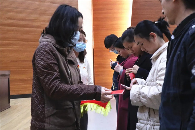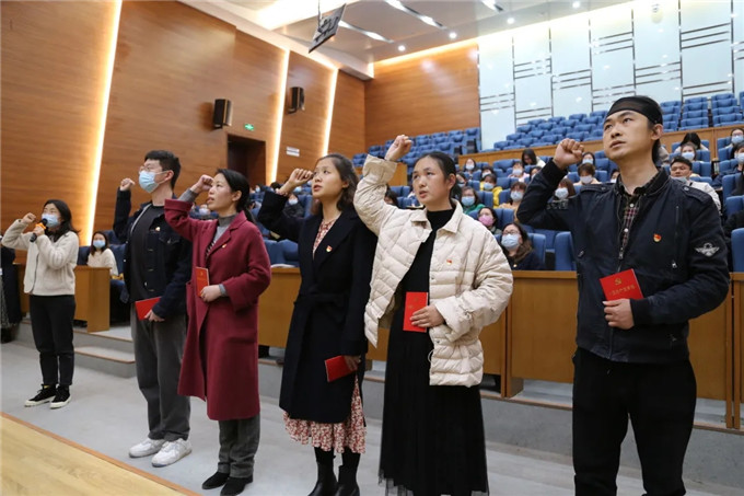 为激励全体党员不忘初心、牢记使命,动员会开始前,学校党委组织了新党员入党宣誓仪式。学校党委副书记、校长许婷为五位新发展的教职工党员颁发了党徽、党章。随后,在组织人事处处长刘应坤同志的领誓下,五位新党员一齐举起右手,面向党旗,庄严宣誓,教育与管理学院唐德拯代表新党员作表态发言。