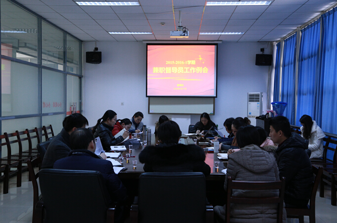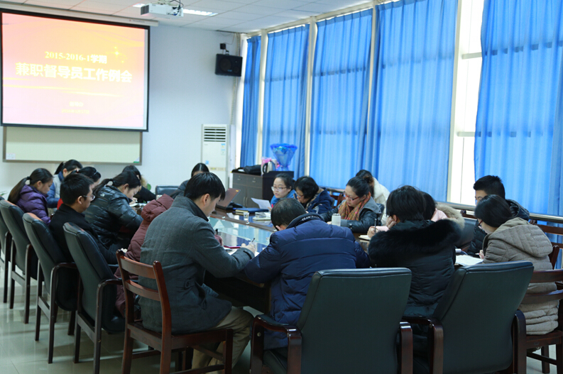 2016年1月17日,我校组织召开了2015—2016学年第1学期兼职督导员工作会议,会议内容主要是交流和总结本学期的教学督导员听课督教情况。副校长孙翔、全体兼职教学督导员及教学督导办工作人员参加了会议。