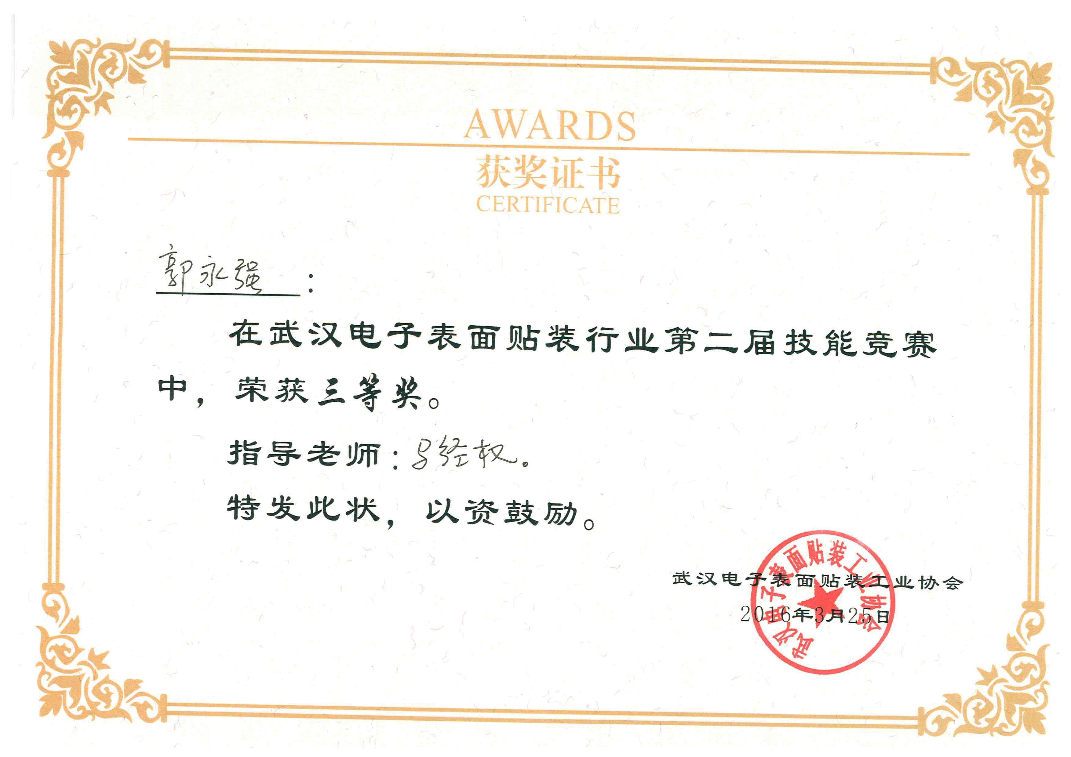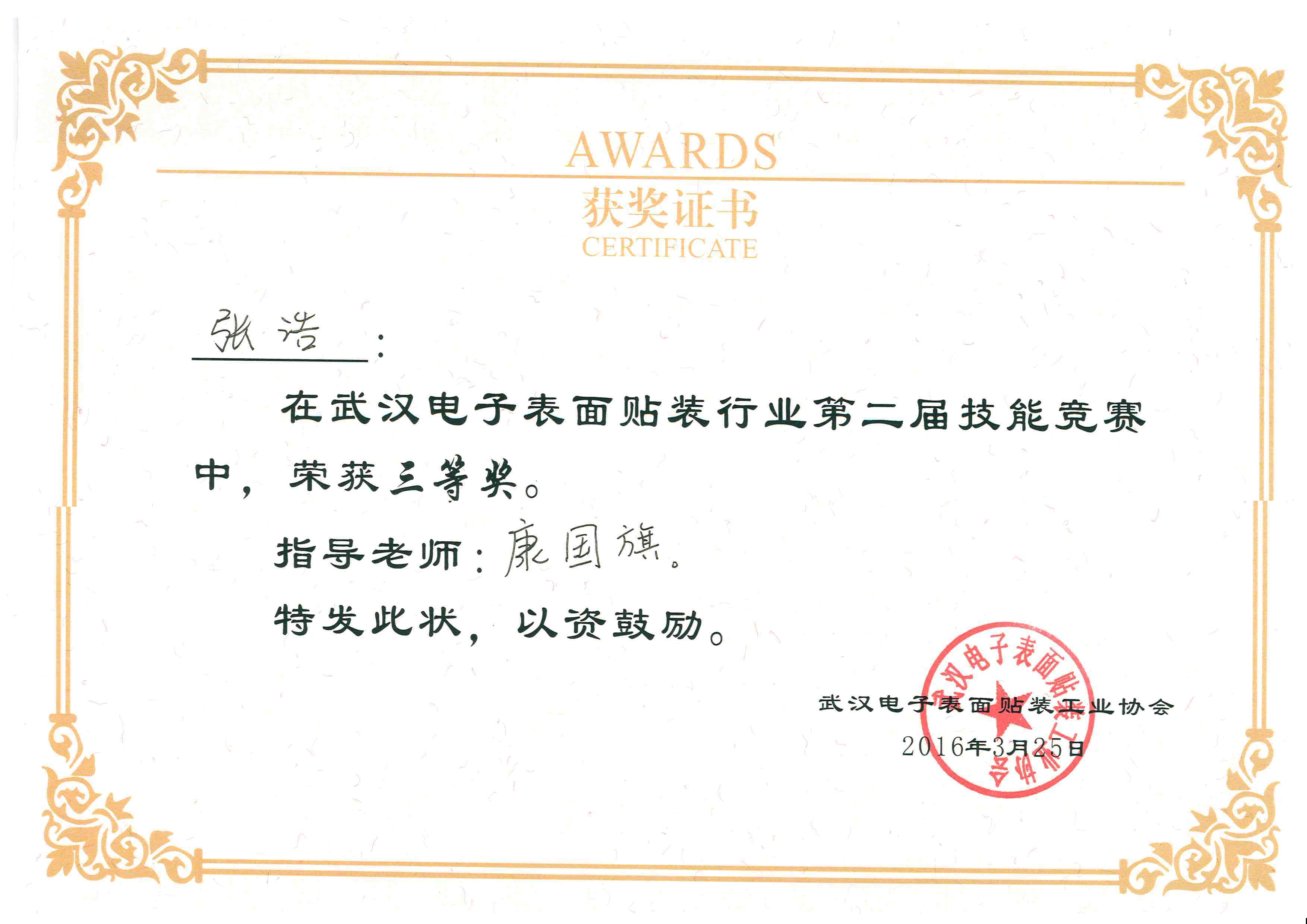 近日,由武汉电子表面贴装工业协会举办的第二届技能竞赛在武汉软件工程职业学院落幕,我校2014级电子信息工程技术专业张浩、郭永强、刘子阳荣获三等奖。