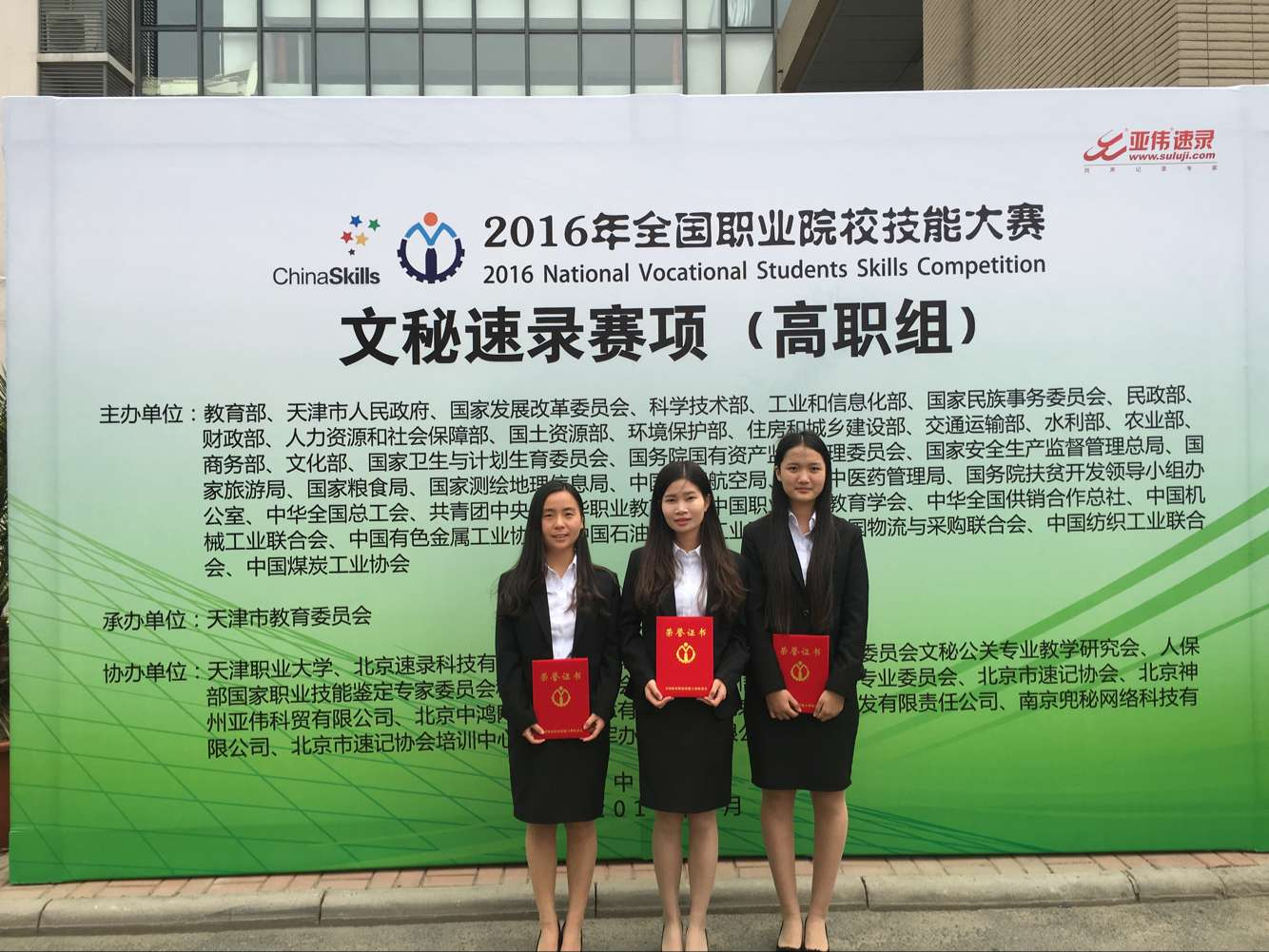 近日,2016年全国职业院校技能大赛文秘速录赛项8日在天津结束。我校2014级文秘速录专业徐瑜、余紫薇、张倩等三名同学组成的湖北省代表队凭借高超的速录技能、优秀的综合素质、稳定的临场发挥勇夺全国三等奖。