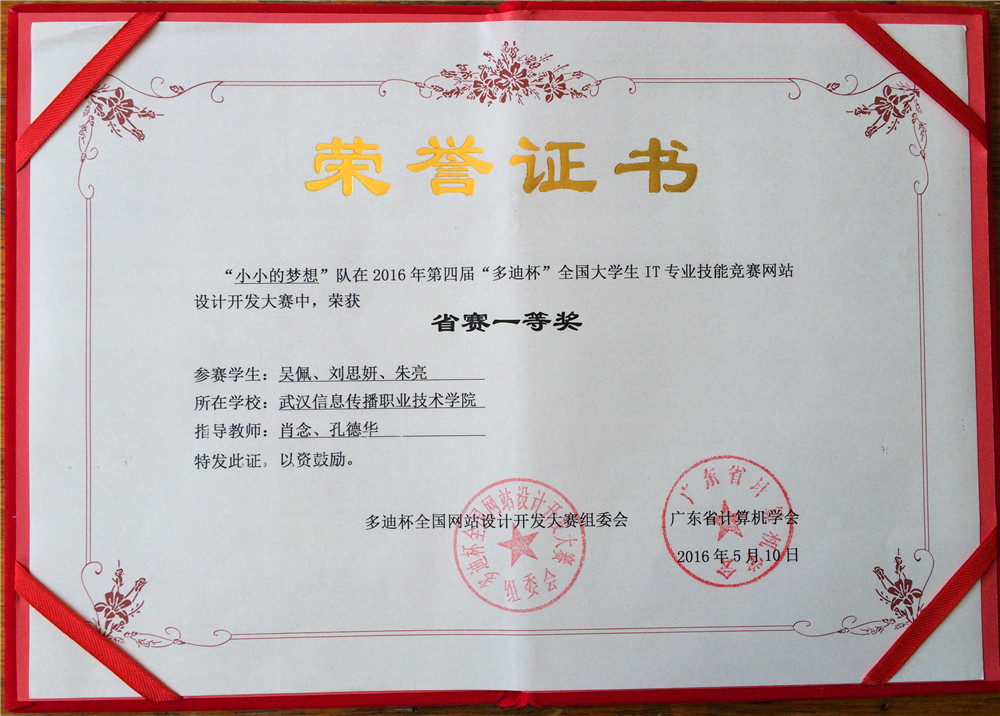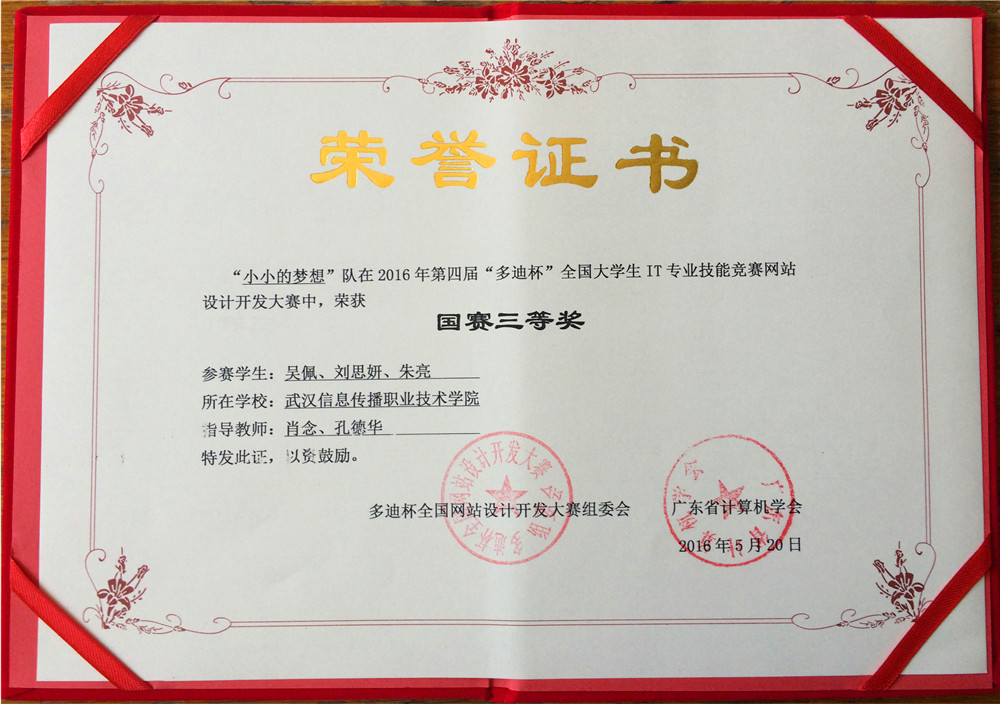 近日,2016第四届“多迪杯”全国大学生IT专业技能竞赛网站设计开发大赛在广东举行。由我校信息工程系2014级软件技术专业吴佩、刘思妍、朱亮等三名同学组成“小小的梦想”参赛队,在两名指导老师精心指导下,一路过关斩将,取得了湖北省一等奖,全国三等奖的优异成绩。