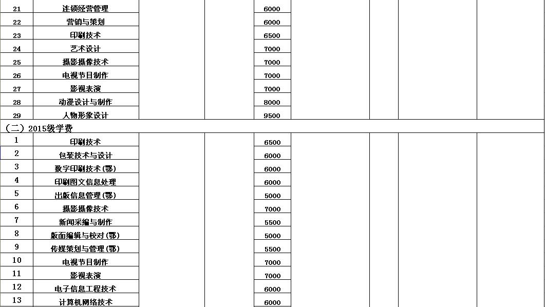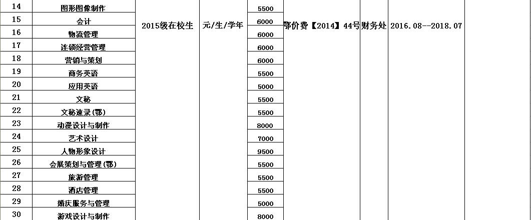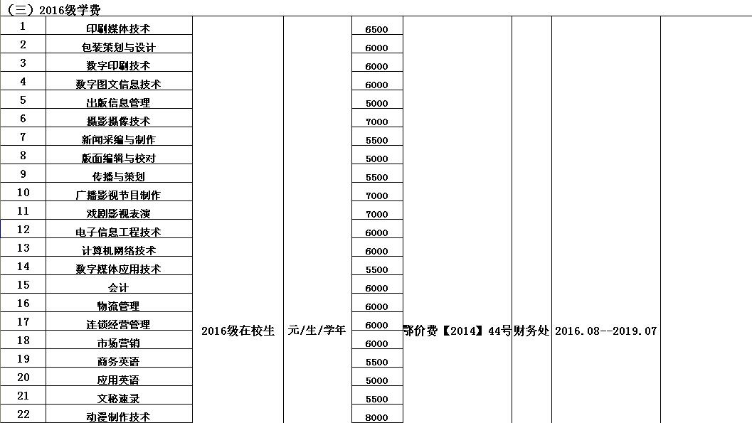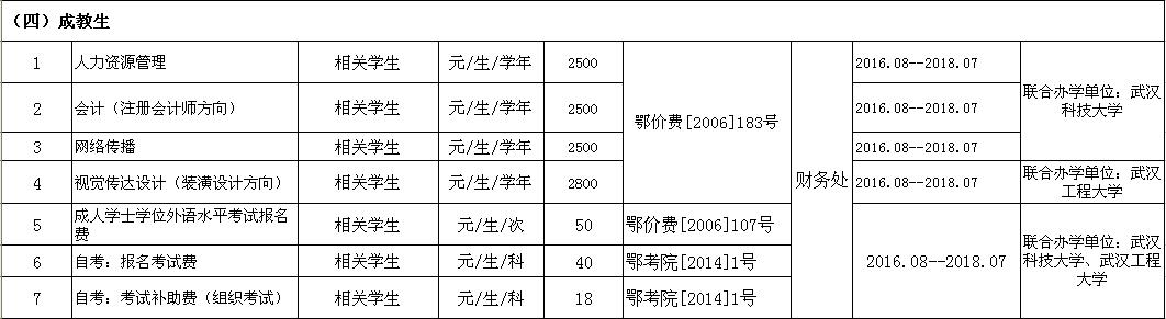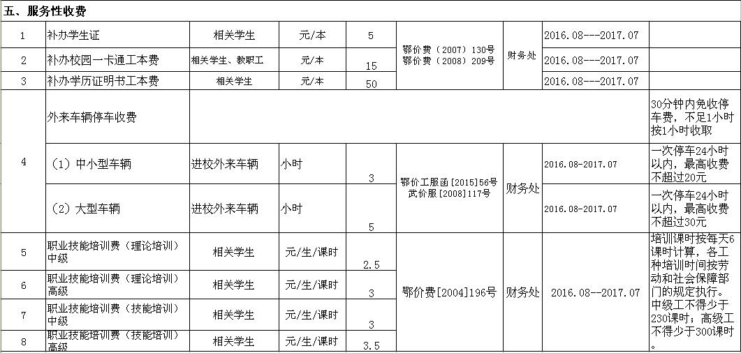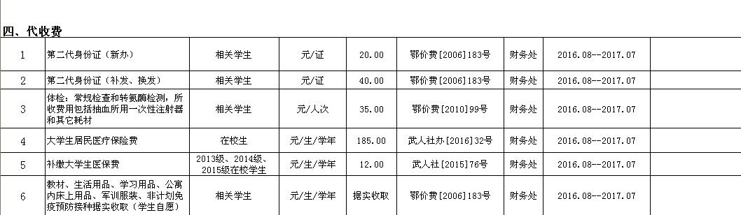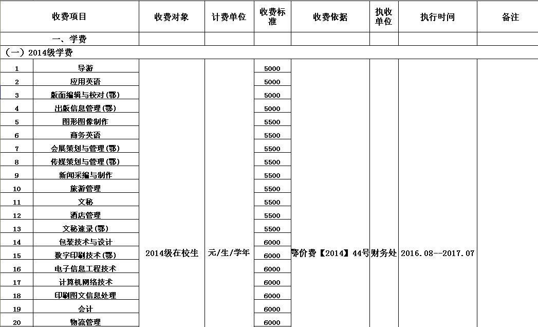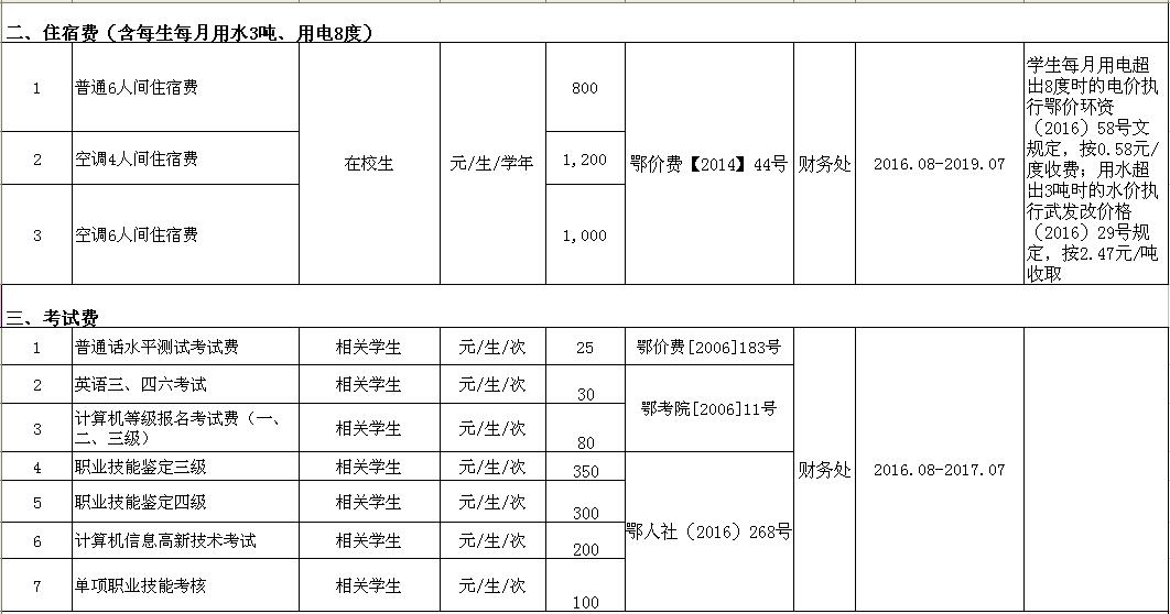 武汉信息传播职业技术学院2016-2017学年收费目录清单