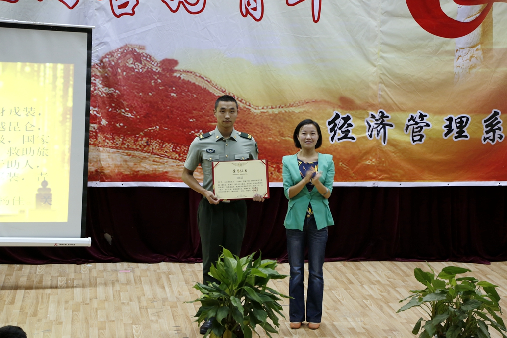 2016年10月18日晚,经济管理系为荣获首届“经管好青年”荣誉称号的9名学生举行了隆重的表彰颁奖仪式。仪式开始,首先以视频展播的形式,介绍了获奖者的事迹。经济管理系党支部副书记、副主任向宏彩为获奖者依次颁奖,辅导员芦杰老师宣读了系分团委给予每位获奖者的颁奖词,9位获奖者依次发表了获奖感言。随后,由向宏彩老师主持,9位获奖者和在场的各班级学生代表进行了交流互动,分享了他们各自在退伍入学求知、孝敬长辈、刻苦学习、努力克服家庭困难和自身身体困难、大胆创新创业和全面发展等方面的经历和心路历程。现场观众通过提问互动,不仅直接地了解了获奖者立志拼搏、向上向善、自立自强、勇于担当的行为,还感受了获奖者在学习生活中形成的优秀的精神品格。现场热烈的掌声,代表着学子对获奖者的敬意,也代表着对自我的鼓励。
