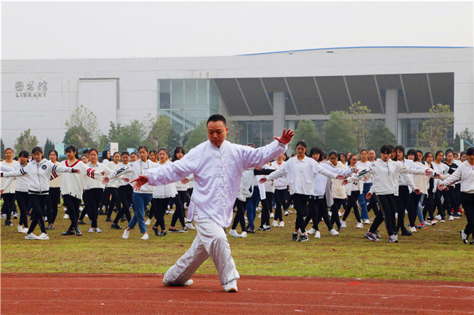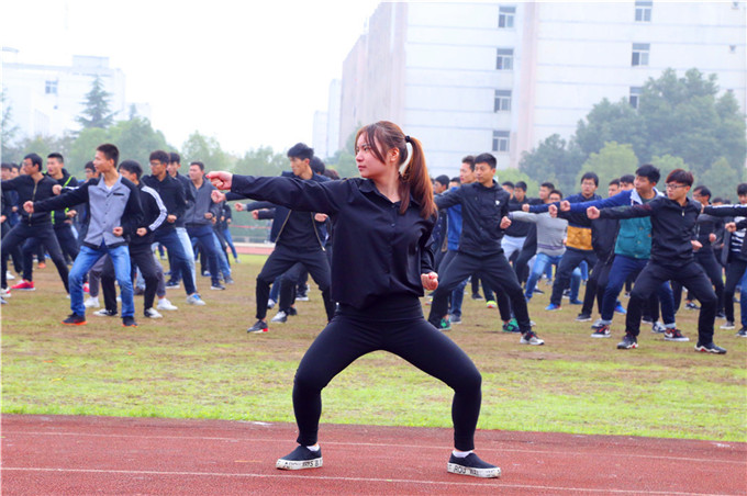 作为我校运动会的一项传统,团体操成为每年最大的亮点。今年的团体操以军体拳加太极拳的形式展现,也更凸显运动主题。由800名学生组成的表演方队,一边是400名男生刚劲有力的军体拳表演,一边是400名女生轻灵圆活的太极拳表演。一刚一柔、一动一静、一阴一阳,最后全体表演者汇聚成中国传统太极图,表现武信学子团结一心、爱校荣校的凝聚力量。