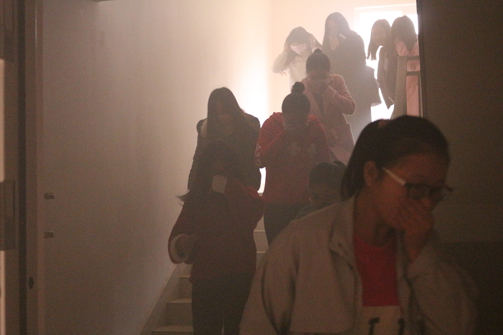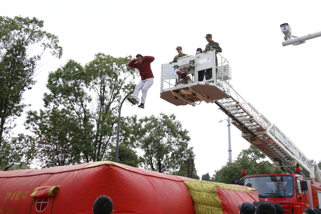 中午1点,8栋学生公寓楼内浓烟四起,“火灾”警报声急促,楼内学生在保安员、宿管员以及学生干部的带领下,有序疏散到楼外空地,消防车及时赶到,及时对“火灾”进行了处理。这是本次火灾应急演练的疏散演练环节。紧接着,进行的是逃生演练。在消防官兵示范后,我校20余名学生勇敢地从消防云梯上跳到救生气垫,顺利完成逃生演练。最后,进行的是灭火演练。两名消防官兵现场演示了灭火器和消防水带的使用方法。在专业技术的指导下,师生代表和保安员分组进行了灭火演练。