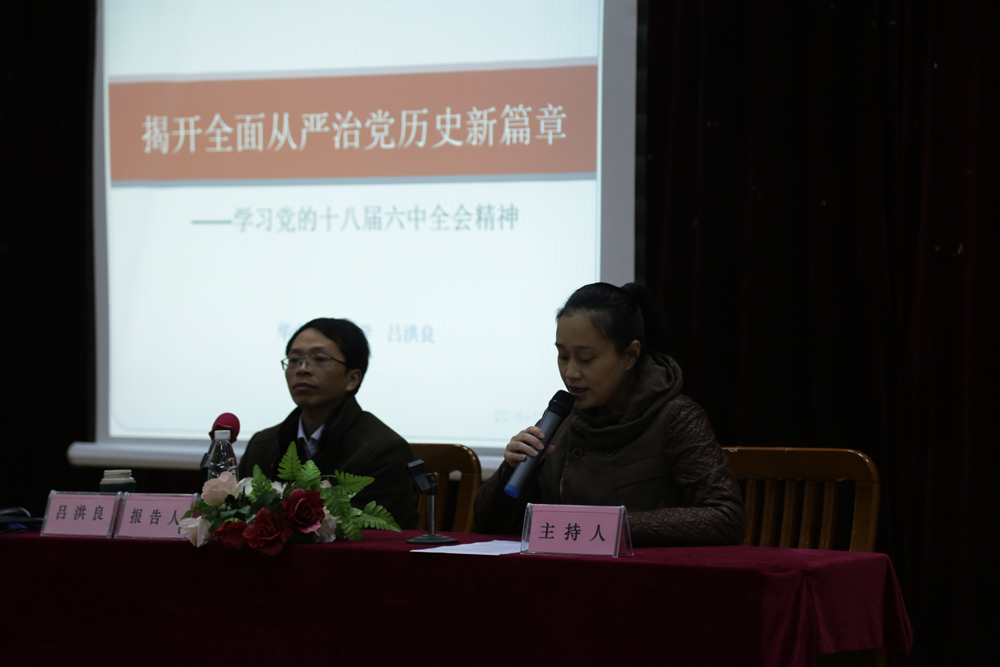 会上,吕洪良副教授以《揭开全面从严治党历史新篇章》为题,重点阐述了党的十八届六中全会的重要意义和历史贡献,确立以习近平同志为核心的党中央的内涵及重大意义,《准则》和《条例》出台的背景和基本内容,《准则》和《条例》对全面从严治党的强化,《准则》和《条例》的实施等方面的内容。