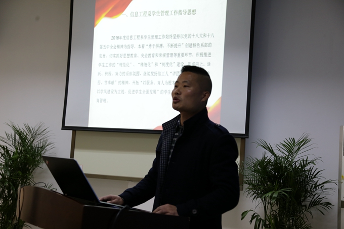 会上,各系分管学生工作的副主任以PPT的形式,分别从党团建设、队伍建设、安全稳定、日常管理、文明寝室建设等方面,利用大数据、数据汇总分析、图片等生动形象地展示了2016年系级学生工作所取得的成效。如传媒影视系以成立工作室的形式拓展学生专业能力;印刷与包装工程系加强学生干部队伍建设,提高学生干部的执行力;信息工程系狠抓学生管理的精细化,学风建设大步前进;经济管理系依托“红五月”等品牌活动,加强党团建设;旅游管理系引入“三个一”工程,着力培养学生能说会写的能力;人文科学系充分利用校外资源,大力开展志愿服务活动;艺术设计系实行学生归寝每日晚报制度,做到“去向有人知,安全有人晓”,等等。
