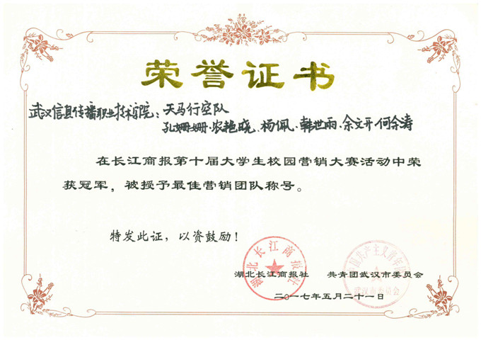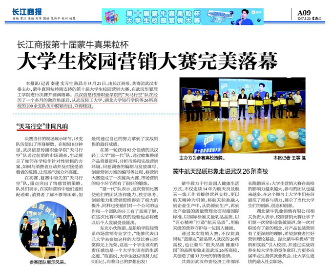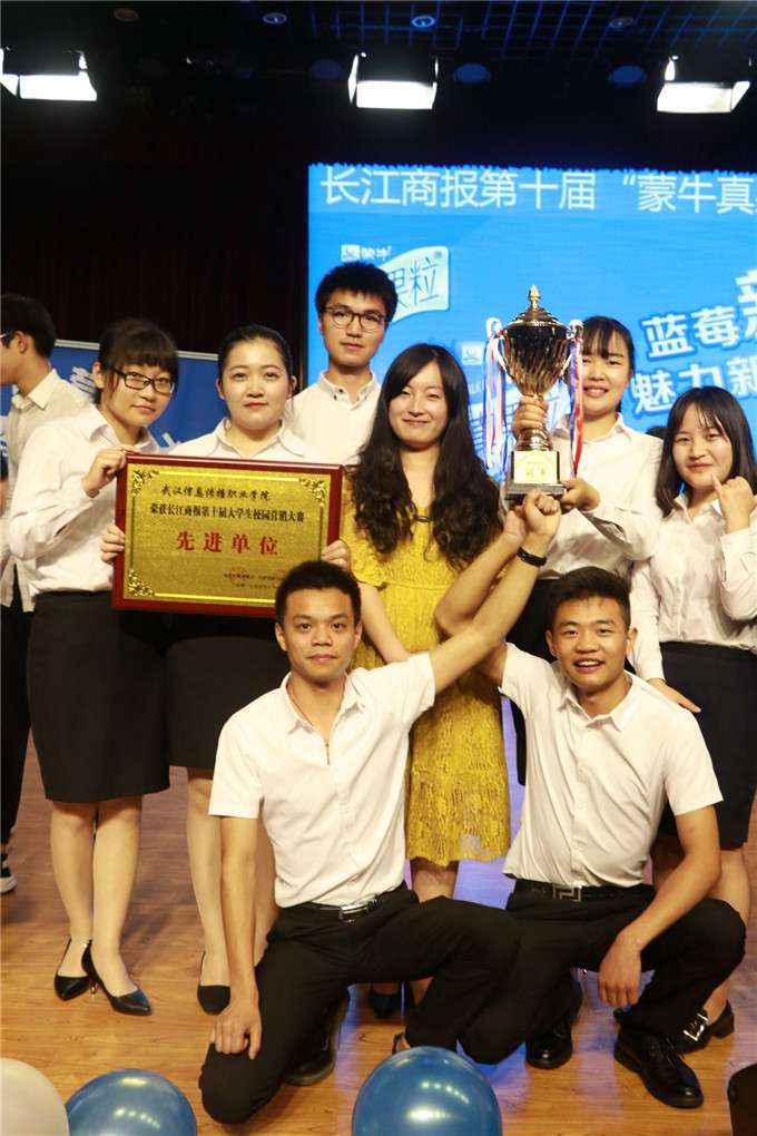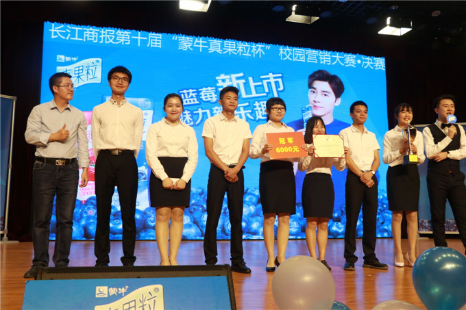 5月21日下午,由共青团武汉市委、湖北长江商报社主办的第十届“蒙牛真果粒杯”大学生校园营销大赛在汉落幕,我校“天马行空”团队荣获大赛冠军。