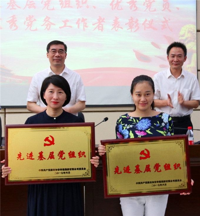 我校优秀党务工作者吴展宏(左二)和胡辉(左四)领奖