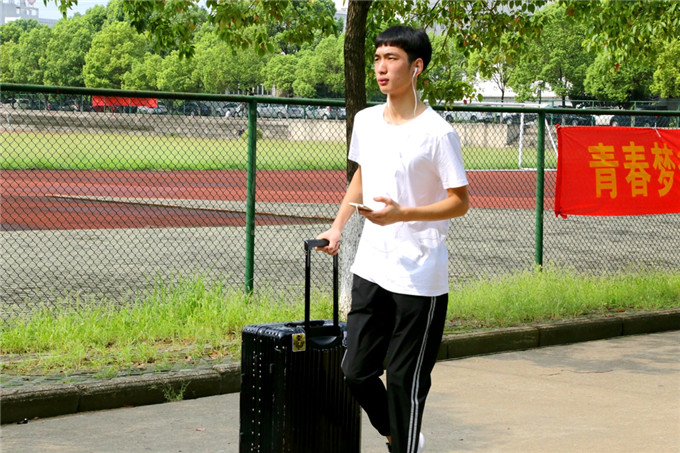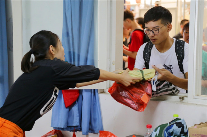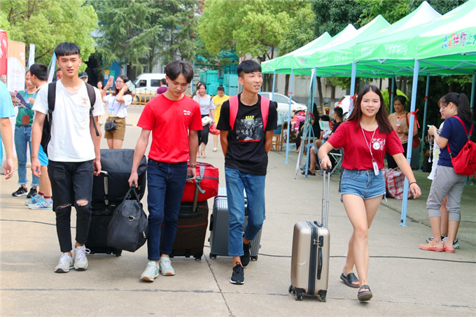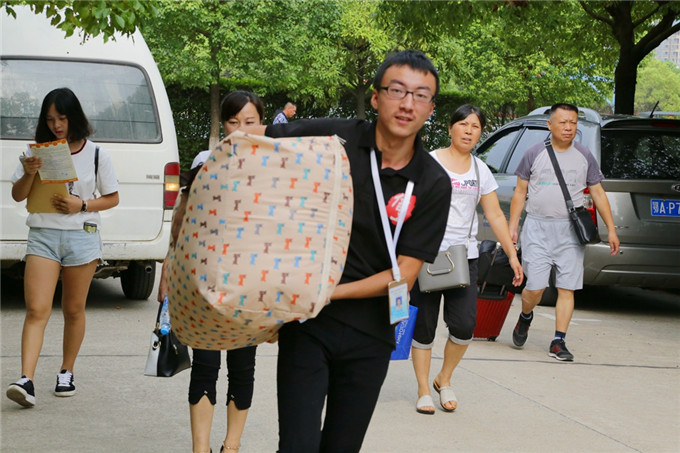学生干部志愿者热情地给新生和家长引路、搬运行李