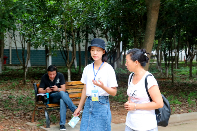 学生干部志愿者带领家长熟悉校园、介绍学校情况,让家长放心