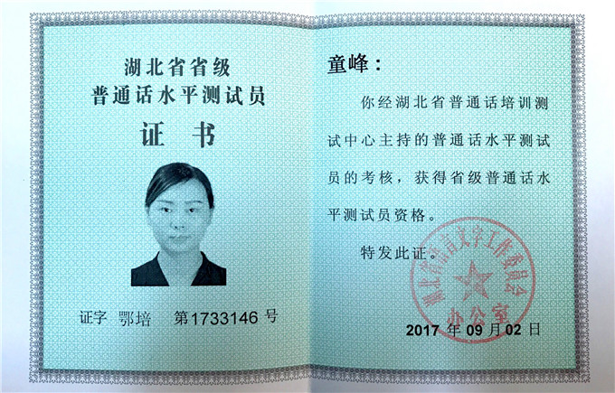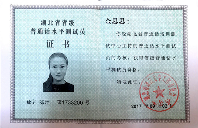 9月3日下午,湖北省第33期普通话水平测试员资格考核培训班在华中师范大学举行结业典礼,我校选派的金思思、童峰两名教师顺利通过考核,取得省级普通话水平测试员资格。