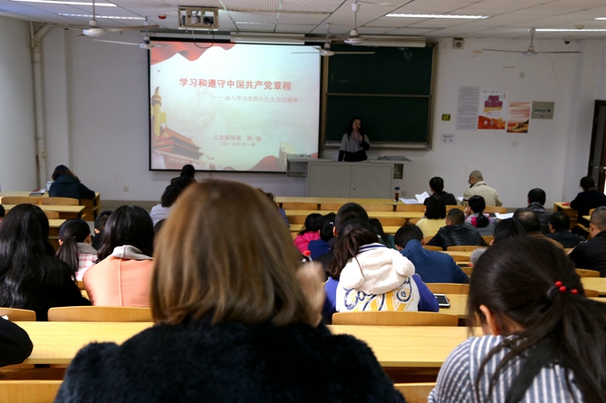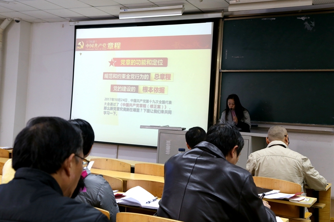 全体与会人员重点学习了党的十九大通过的《中国共产党党章(修正案)》。思政课教研室主任孙瑛老师担任主讲,她从党章的地位、党章的历史、十九大新修订的党章内容、党章修订的重要历史意义等方面,解读了党的新思想、新纲领,阐释了共产党人的新目标、新愿景。她认为,党章是每一个党员最根本的遵循,每个党员要学透、弄懂党章的每一项规定,要自觉成为遵守党章的模范。