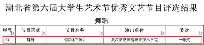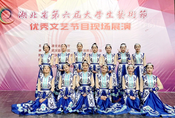 近日,湖北省教育厅公布了全省第六届大学生艺术节优秀文艺节目展演评选结果,我校选送的由大学生艺术团表演的群舞《塔林呼恒》荣获一等奖。王雯婧、朱慧娟两位老师荣获优秀指导教师奖。