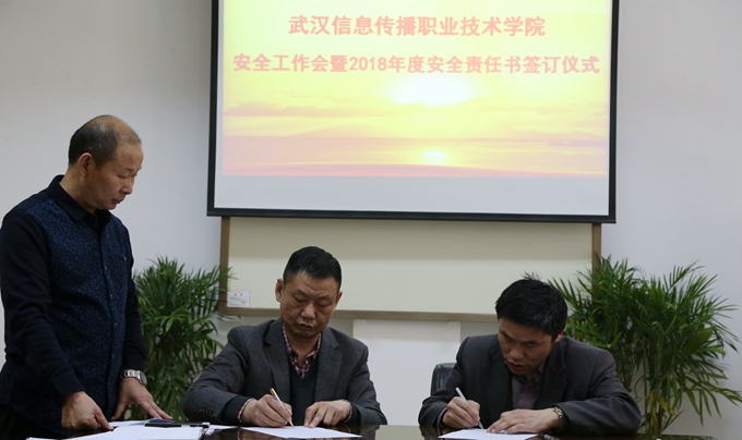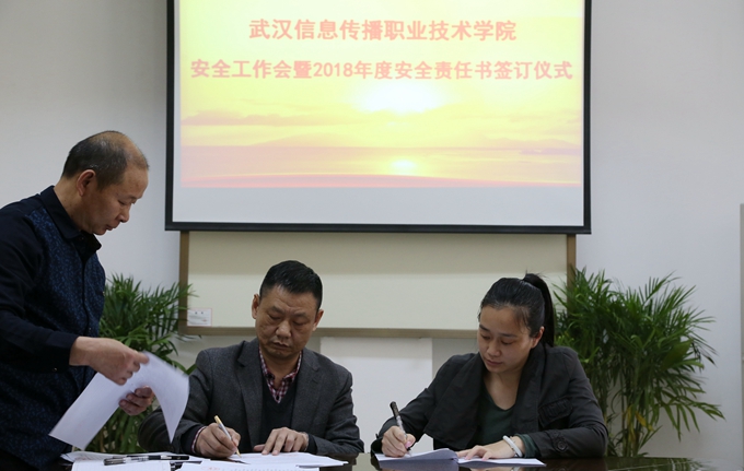 在安全责任书签订仪式环节,党委副书记、校长许婷代表学校与分管安全工作的副校长杨继兵签订了《2018年消防安全工作目标管理责任书》和《2018年综治维稳安全工作目标管理责任书》。随后,副校长杨继兵与信息技术中心、餐饮中心和各系、各部门负责人先后签订了网络安全、食品安全等安全目标管理责任书。