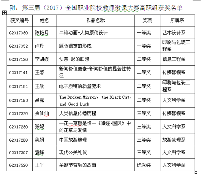 近日,全国职业院校教师微课大赛组委会公布了第三届(2017)全国职业院校教师微课大赛比赛结果,我校教师获得一等奖2个、二等奖4个、三等奖4个、优秀奖1个。此外,我校还获得大赛优秀组织奖和突出贡献奖。