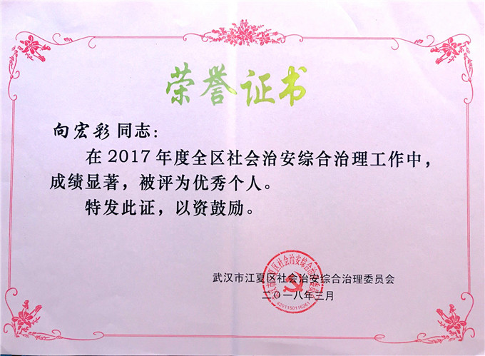 近日,在江夏区委召开的2018年江夏区委政法工作会议上,对2017年度全区社会治安综合治理检查考评工作情况进行了通报。我校被授予“2017年度江夏区社会治安综合治理优胜单位”荣誉称号,信息工程系被授予“2017年度江夏区平安院系”荣誉称号,经济管理系行政副主任向宏彩被授予“2017年度江夏区社会治安综合治理优秀个人”荣誉称号。我校已连续5年获此殊荣。