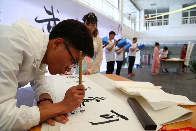 “朋友!中国是生育我们的母亲。你们觉得这位母亲可爱吗?我想你们是和我一样的见解,都觉得这位母亲是蛮可爱蛮可爱的……”在当天开幕式的舞台上,在传媒影视系浮生绘工作室慷慨激昂的《可爱的中国》的朗诵中,风雅国学社和墨轩书法协会的几名同学潇洒挥毫,自信地书写下“可爱的中国”五个大字。古风颂雅,笔墨生香。经典爱国诗文加上传统的书法,再现武信学子追根溯源的初心。