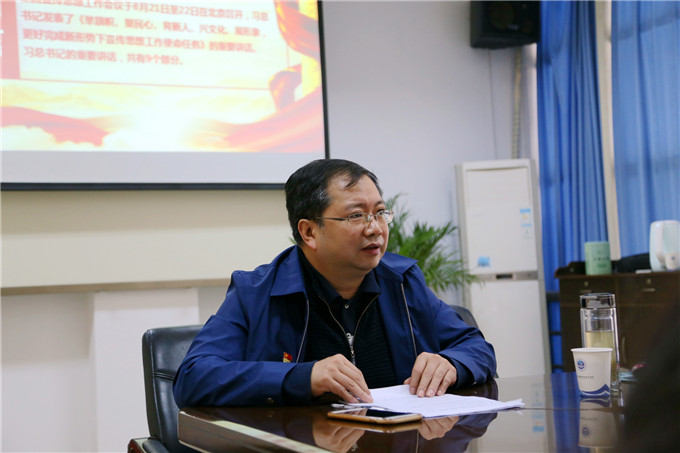 为深入贯彻学习全国宣传思想工作会议精神,10月24日上午,我校党委理论学习中心组召开扩大学习会,湖北知音传媒集团党委委员、副总经理、我校党委书记钱钧同志为中心组成员、在校领导班子成员、全体党支部书记和各部门负责人讲了一堂内容深刻的党课。党课由我校党委副书记、校长许婷同志主持。