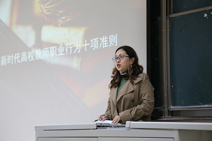 副校长孙翔带领与会同志全文学习了《新时代高校教师职业行为十项准则》。她强调,教育部出台关于教师规范的系列制度,是贯彻落实全国教育大会精神,加强师德师风建设的重要举措。全体教师要认识到准则是教师职业行为的基本规范,要把准则要求落实到具体工作中,努力做“四有好老师”。