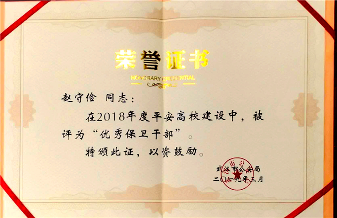 近日,武汉市公安局召开平安高校建设工作总结表彰会,会上,我校被授予2018年度平安高校建设“优秀单位”荣誉称号,保卫处处长赵守俭被评为“优秀保卫干部”,这是继我校在获得江夏区2018年度社会治安综合治理“优胜单位”后,荣获的市级荣誉。