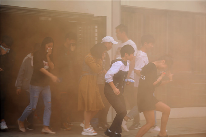 当天上午10时,在8栋学生公寓,随着模拟烟雾弹的爆响,整个公寓楼内浓烟滚滚,火灾警报声急速、持续响起,宿管员、保安员迅速启动应急预案,打开一楼疏散门,从各楼层引导学生有序疏散,学生纷纷用毛巾、口罩捂住口鼻,安全有序地疏散到公寓外安全地点。“模拟的烟雾都这么厉害,太可怕了,以后我们一定会倍加重视防火。”顺利“逃生”的学生不禁感叹到。