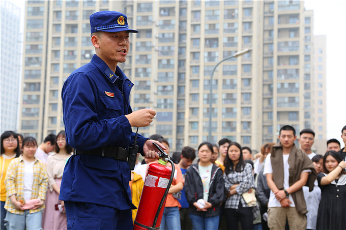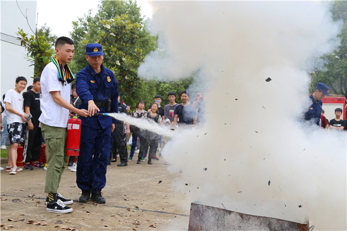 在接下来的灭火演练中,江夏区消防应急救援中队江队长,首先简要点评了火灾疏散演练情况,然后就怎样扑灭煤气罐着火、汽油燃烧,现场进行了讲解和演示,按照标准操作规程,在场师生积极参加灭火器灭火演练。