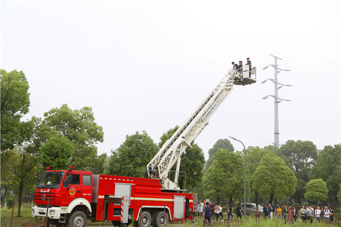 “如果你们所住的高层楼房内失火了,要想逃生怎么办?借助消防云梯逃生将是正确的选择。”在江队长的介绍下,近50名学生分组登上33米消防云梯体验高层逃生。