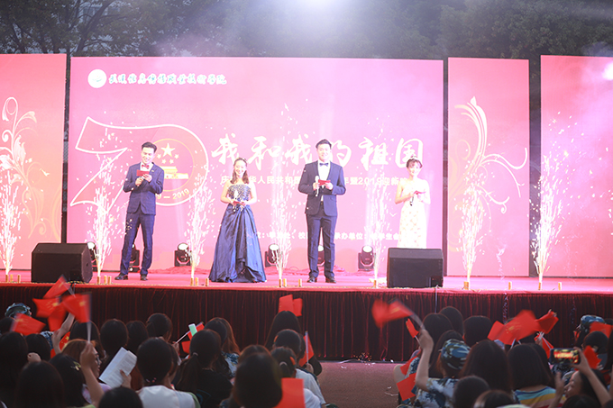 9月11日晚,我校全体新生挥舞着国旗,放声高唱“我和我的祖国”,以特有的青春激情欢庆新中国成立70周年,迎接崭新的大学生活。当晚,我校以“我和我的祖国”为主题的庆祝新中国成立70周年文艺晚会暨2019年迎新晚会在运动场燃情上演。在校校领导、学校党委副书记、校长许婷,副校长孙翔、张秋鸣、尤敏与全体军训教官、全校教职工、2019级全体新生一同观看晚会。