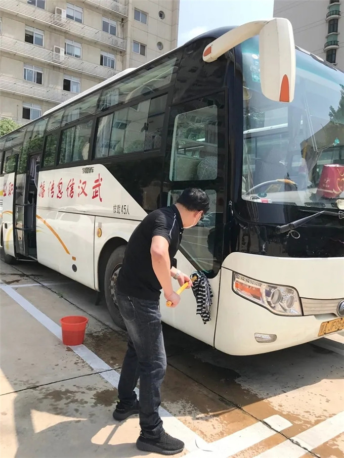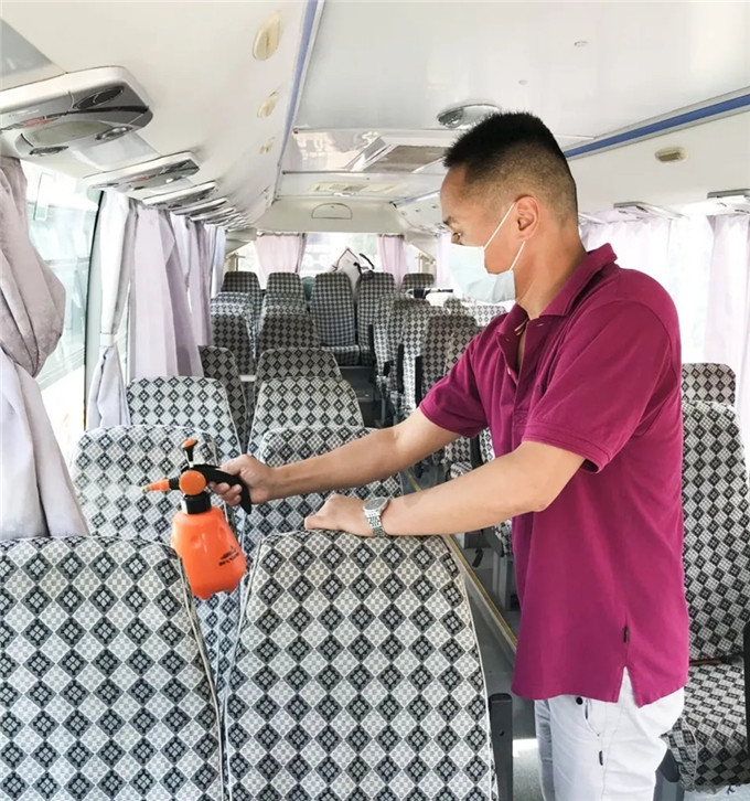 校车师傅兑上消杀药水对通勤车辆进行了仔细打扫