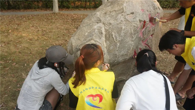 “我报到当天,一进校门就看到了这块‘初心石’?!痹凇俺跣氖贝?,同学们带着激动的心情,用红色油漆一笔一划勾勒初心二字?!敖裉焓切轮泄闪?3周年的日子,没有共产党就没有新中国。中国共产党的初心就是为人民谋幸福、为民族谋复兴。百年大党,初心一直未变。一切向前走,都不能忘记走过的路。唯有不忘初心,才能告慰历史,才能勇往直前。” 向宏彩老师讲述了“初心”二字之于党、国家、学校和青年的意义。