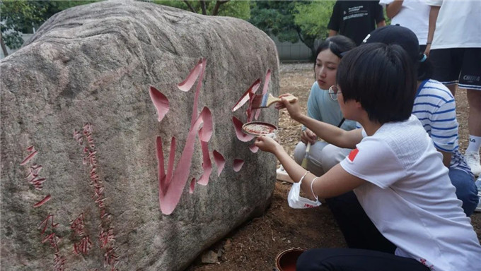 在位于梅园的“思源石”处,同学们争先恐后抢着擦拭有些许风化的石头,大家认真给“思源”二字描红?!八荚?,是一位毕业生情牵母校的感谢、感念。思源,也激励着武信人常怀感恩之心、永葆奋进之志?!毕蚝瓴世鲜δ托慕樯堋八荚词钡睦蠢?,讲述捐赠者翟娜学姐感恩母校培养,立文化石传递“饮水思源、知恩感恩”的情怀。她号召同学们做一个知感恩、懂感恩、会感恩的人。