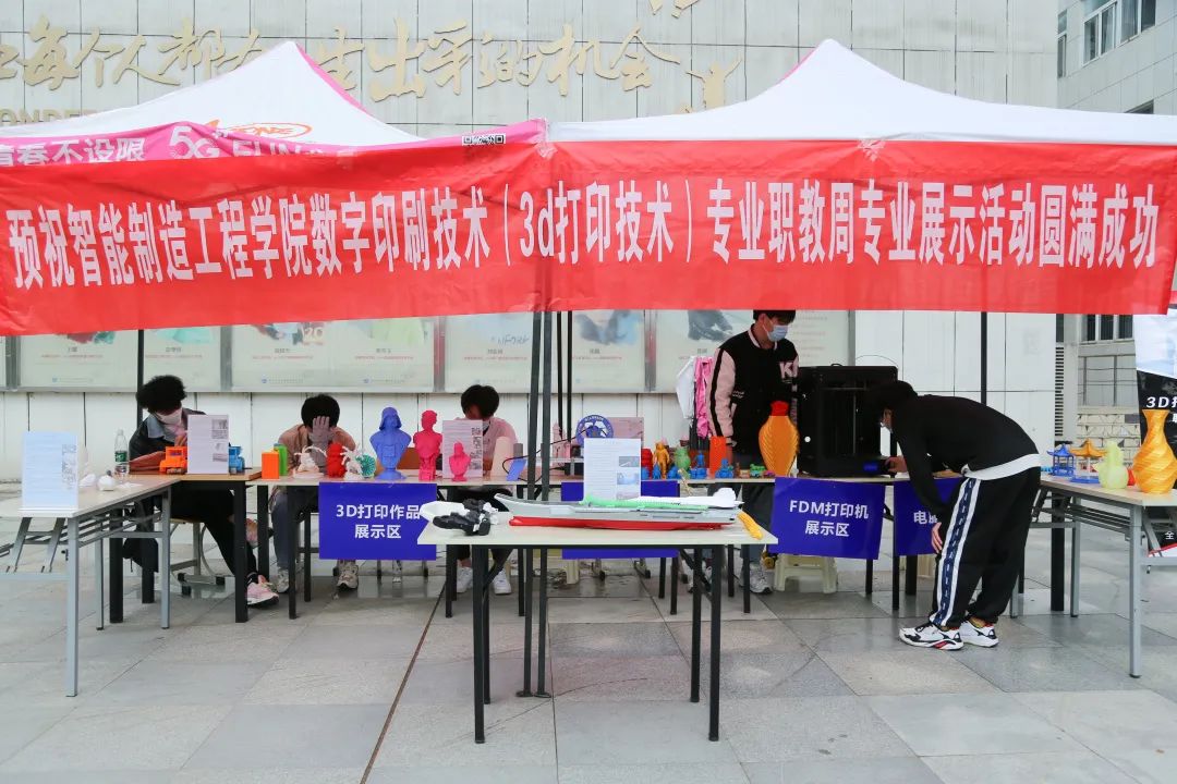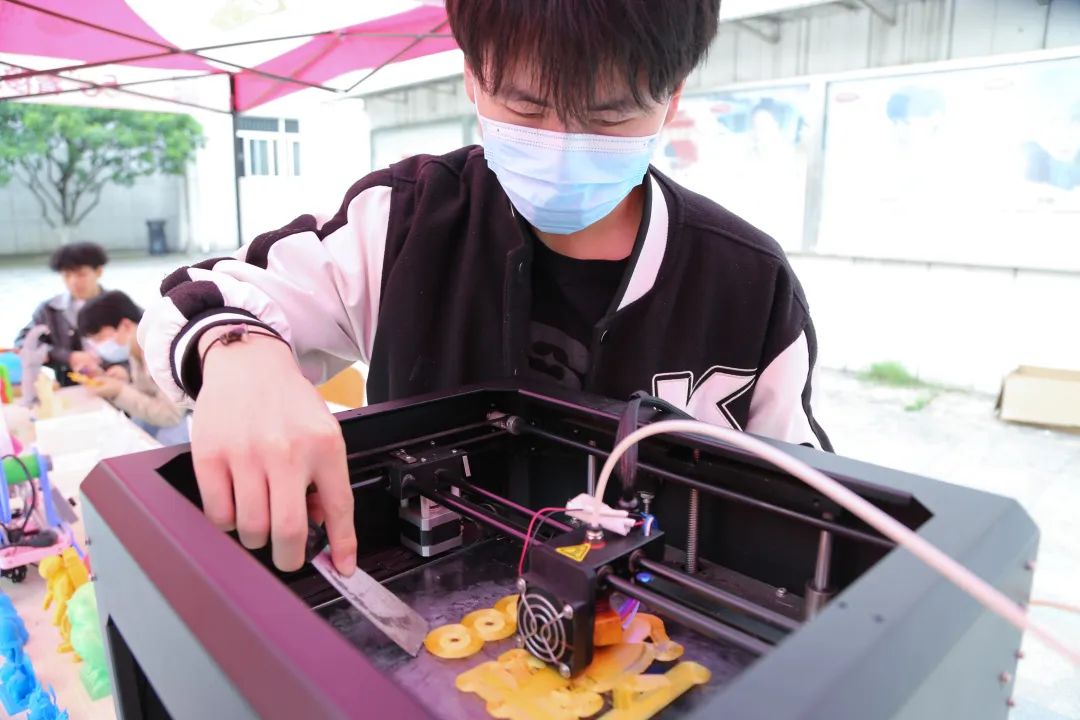 5月11日,教学楼外3D打印技术专业展示现场,从虚拟到实物的完美过程,吸引了不少下课后“看稀奇”的同学。