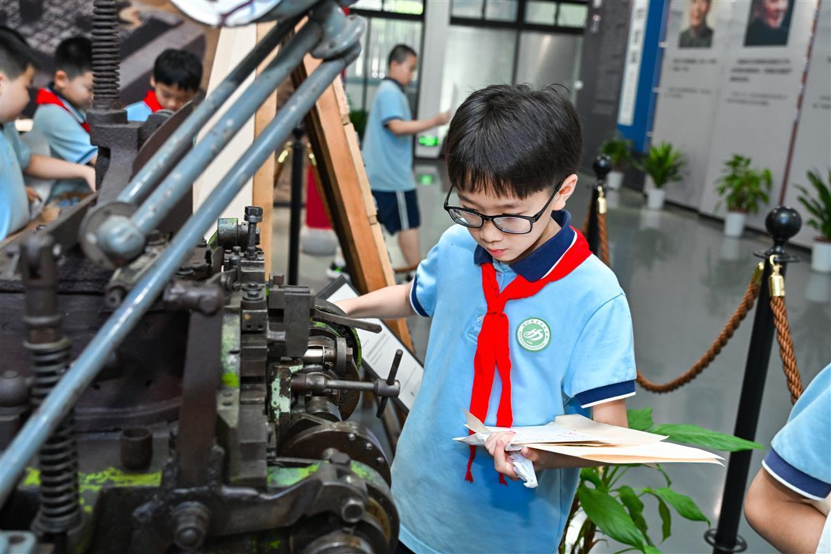 “老师,这台机器还可以使用吗?”“老师,我可以试试吗?”参观过程中,小朋友们好奇地询问。固版、涂墨、铺纸、按压……同学们有的练、有的学,大家迫不及待地围在古登堡印刷机和手扳架印刷机前。“原来,文字可以这样印刷在纸张上。”“哇,我印的是《三字经》。”拿到自己的“作品”,大家开心极了。