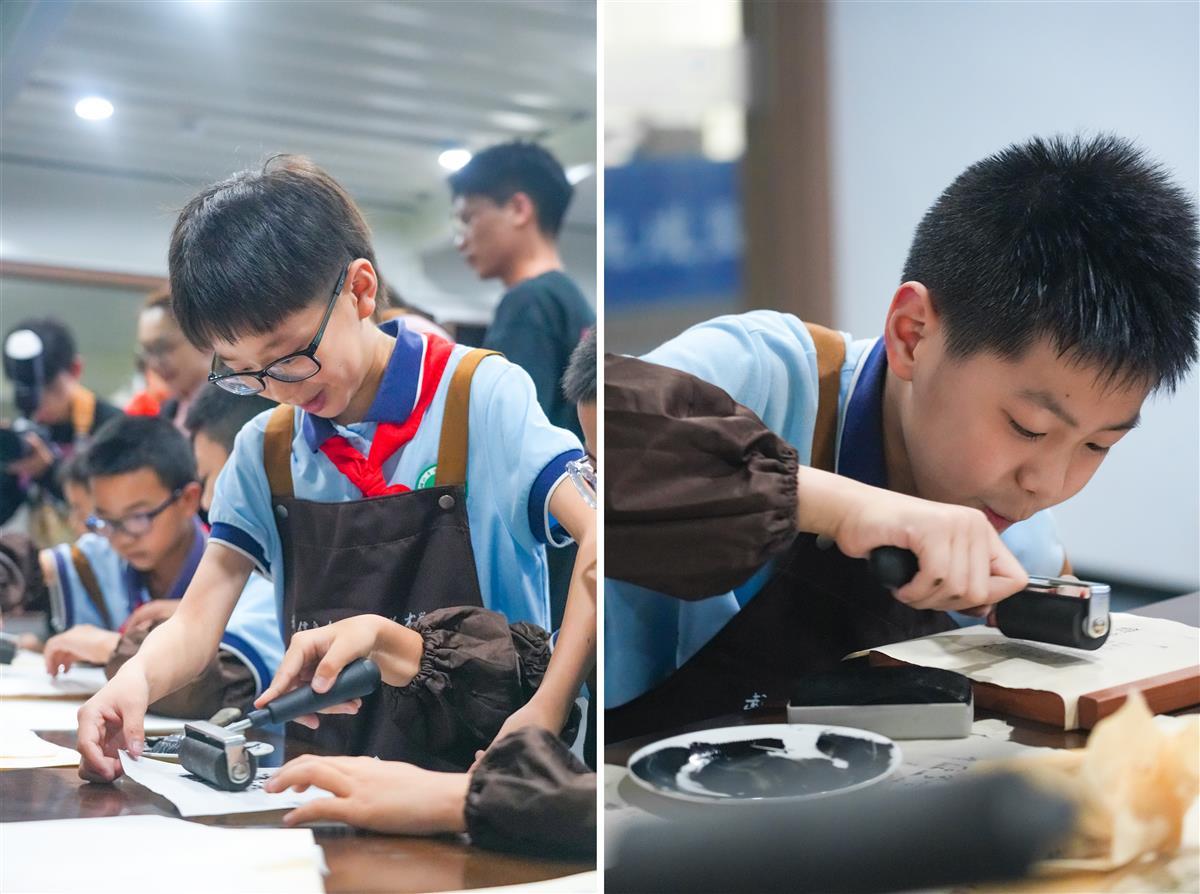 “大家跟着我这样做,把油墨倒在盘中,再用刷子沾墨涂在雕版和铅字上,盖上宣纸,用棕刷用力按压。”在雕版和活字印刷非遗体验馆中,小朋友们一步步学着拓印。“对,就是这样。”“大家太棒了!”