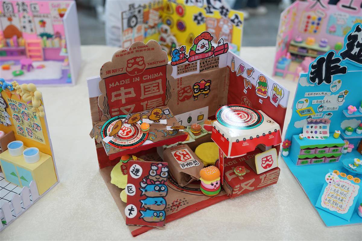 “好有意思啊。”“构思好巧妙。”幼儿手工作品展区,同学们精心制作的富含趣味故事的绘本,囊括二十四节气、非遗技艺、寓言故事、古代神话等主题,绘本以平面、立体等形式呈现,还暗藏许多互动“小机关”;以童真笔触与童趣视角绘制的云肩、纸鸢,融入中华优秀传统文化元素和荆楚文化元素;用超轻黏土、ppc板、无纺布等材料制作的幼儿园区角让人眼前一亮。