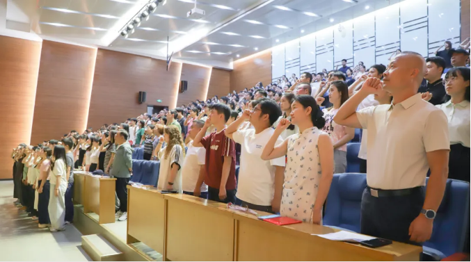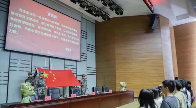 “我志愿成为一名光荣的人民教师……”在党委委员、副校长蔡明的领誓下,新入职的教师面向国旗庄严宣誓,表达“以教育家精神铸魂强师、谱写教育强国建设华章”的坚定决心。其他教职工也一同重温了誓词。