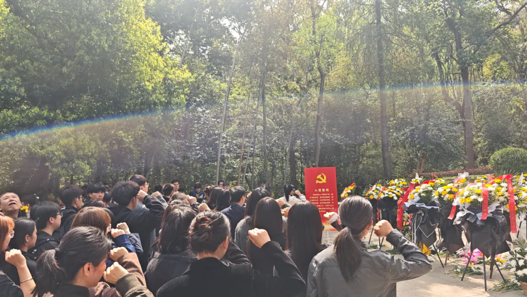 重温入党誓词,唯以初心践誓。“我志愿加入中国共产党,拥护党的纲领……”全体师生高举右拳,重温入党誓词。铿锵誓言回荡在陵园上空,与先烈们的革命精神交相辉映。