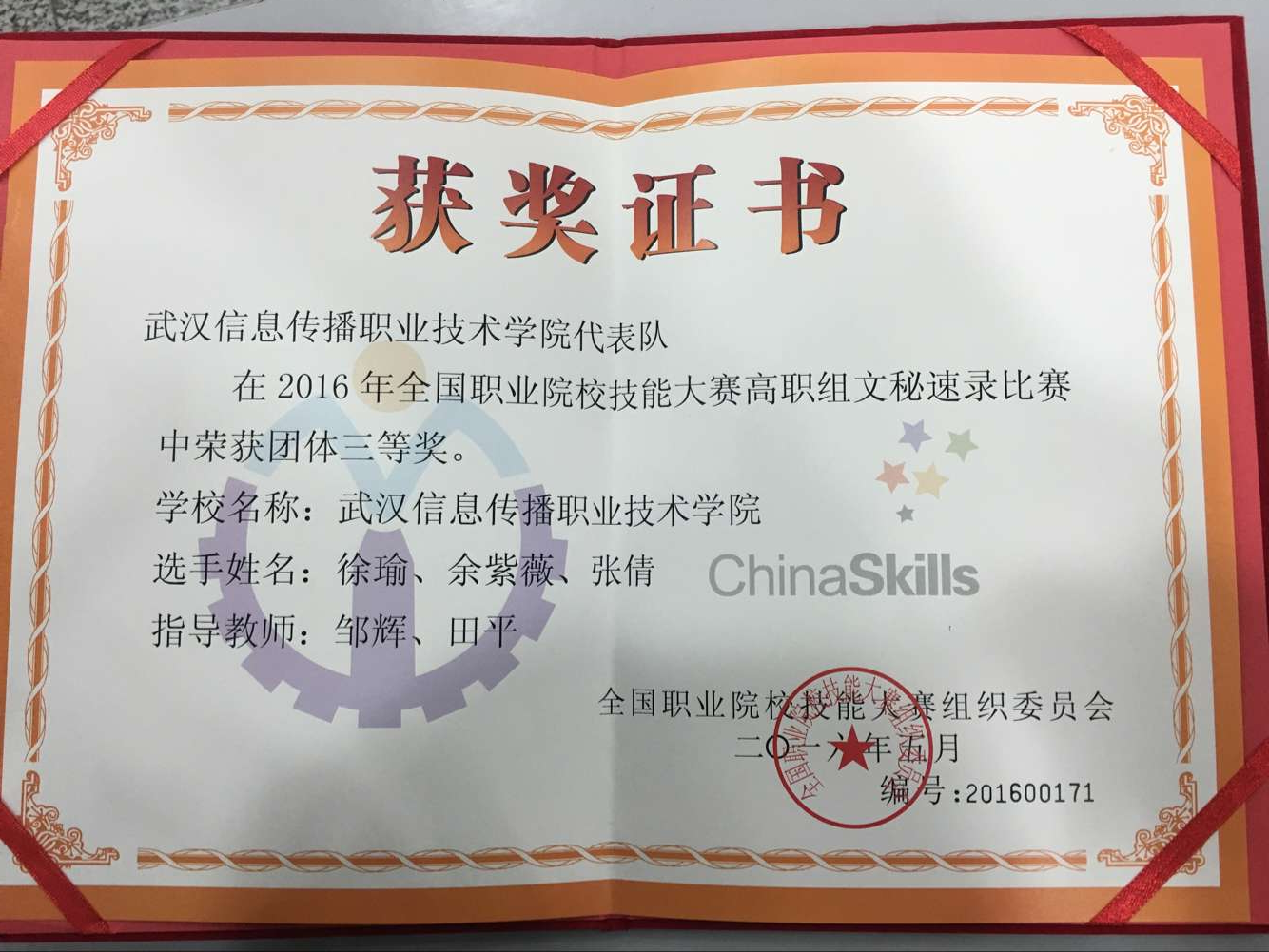 近日,2016年全国职业院校技能大赛文秘速录赛项8日在天津结束。我校2014级文秘速录专业徐瑜、余紫薇、张倩等三名同学组成的湖北省代表队凭借高超的速录技能、优秀的综合素质、稳定的临场发挥勇夺全国三等奖。