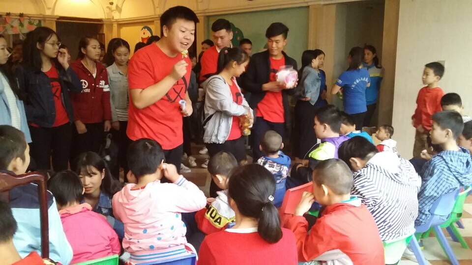 一首手语歌《中国人》拉开了活动帷幕,随着魔术《消失的牛奶》、舞蹈《摩登女孩》等精彩节目的上演,现场气氛渐入佳境。也许是感受到了志愿者们满满的爱心和诚意,奇迹发生了——在《小苹果》欢快的节奏中,一位小朋友按捺不住主动加入志愿者们的舞步。无独有偶,当志愿者用吉它弹唱《父亲》时,没想到小朋友也会唱,瞬间变成全场大合唱!在老师的鼓励下,几位小朋友也站起来表演节目。一位小朋友因不能长久站立,一旁的老师还帮着他拿着话筒。他稚嫩的歌声,一瞬间击中了大家内心的柔软之处,一阵掌声油然而起…… 文艺表演结束后,志愿者们给小朋友们分发了他们自筹准备的糖果、零食、玩具等。