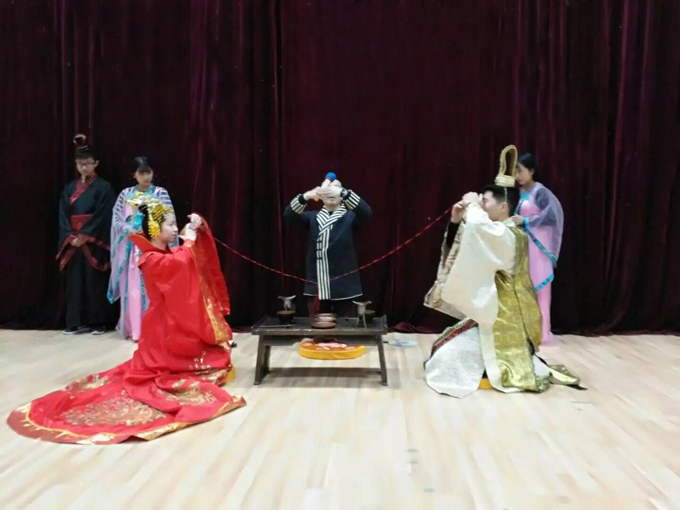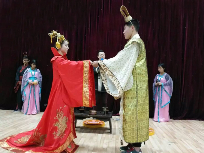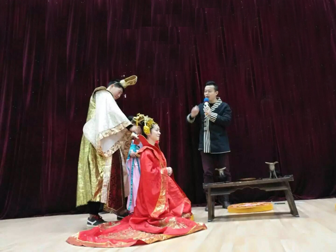 随后,贺嘉老师为了让同学们更加直观地了解中式婚礼,组织六名同学现场扮演婚礼中的不同角色。六名同学在贺嘉老师的主持下,依次作了迎亲礼、揖礼、却扇、食礼、合卺礼和掩蔽等中式婚礼中的礼仪环节。通过现场体验,让同学们巩固专业知识,加深了对婚庆服务行业的了解。