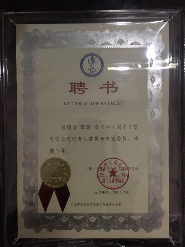 2017年3月12日,全国文秘综合技能竞赛高端论坛和中国中文信息学会速记专业委员会常务委员会议在福州闭幕,我校人文科学系文秘速录教研室主任邹辉老师当选为专家委员。