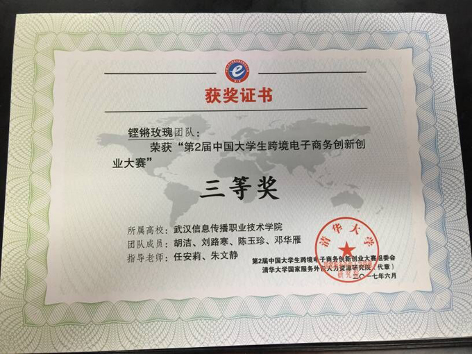 近日,第二届中国大学生跨境电子商务创新创业大赛总决赛帷幕。我校人文科学系2015级商务英语专业胡洁、刘路寒、陈玉珍、邓华雁等四名同学组成的“铿锵玫瑰”团队荣获全国三等奖、湖北省分赛一等奖。
