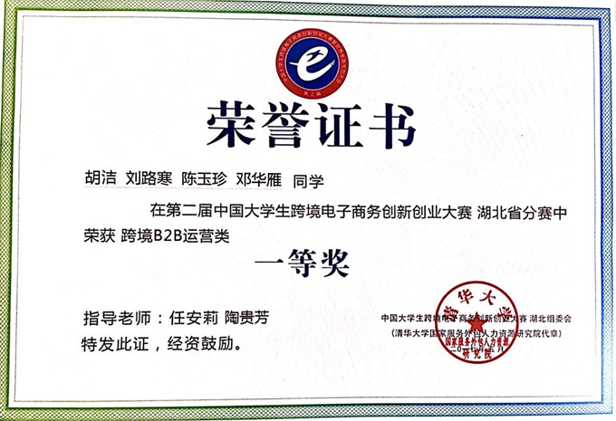 “铿锵玫瑰”团队的四名同学在进驻赛事方指定联动企业后的一个月里,克服生活学习困难,全身心地投入产品学习和网站运营中,相互配合完成了从产品图拍摄、PS、上传到网站等全部流程。在比赛中,四名同学充分利用在校学习的跨境电商知识和技能,不畏强手,勇于拼搏,最终获得了湖北赛区一等奖,并代表湖北赛区参加了全国总决赛,荣获大赛A类(即跨境B2B运营技能竞赛)三等奖。
