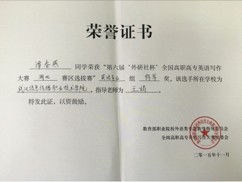 近日,第六届“外研社杯”全国高职高专英语写作大赛落下帷幕。经过激烈的角逐,我校应用英语专业1401班谭春燕同学脱颖而出,荣获英语专业组湖北省特等奖,并代表湖北省赴京参加了全国总决赛,荣获全国三等奖。