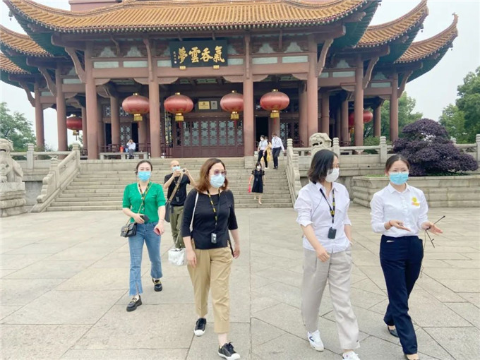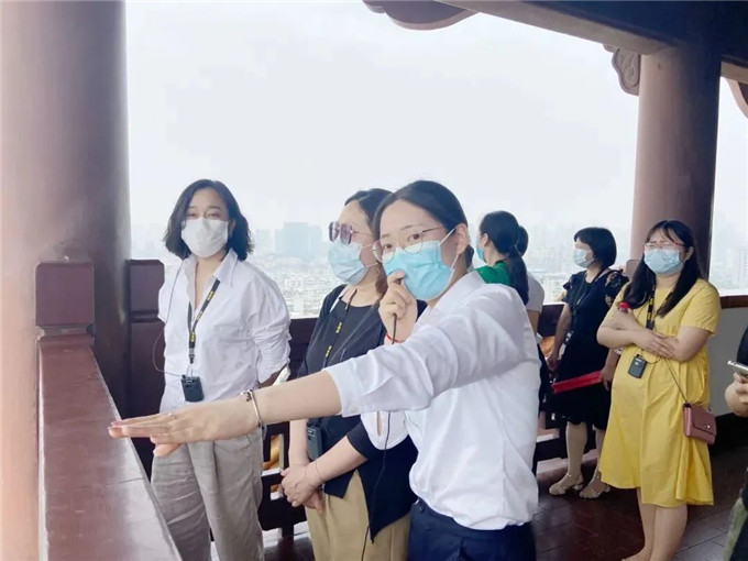在黄鹤楼公园暨黄鹤楼假日国际旅行社,走访团一行参观了黄鹤楼公园园区,了解了学生就业实习环境,黄鹤楼公园优秀讲解员、我校2018届毕业生陈小芳向校领导一行作了精彩的讲解。