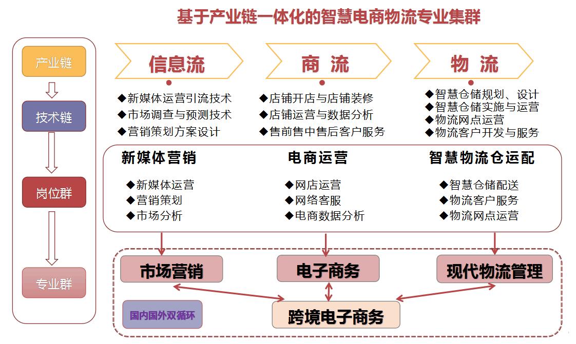 本专业群包括电子商务、市场营销、现代物流管理和跨境电商四个专业。专业群以电子商务专业为核心,以市场营销和现代物流管理专业为骨干,融合跨境电子商务专业,构建国内国外双循环的电商全产业链人才培养平台。